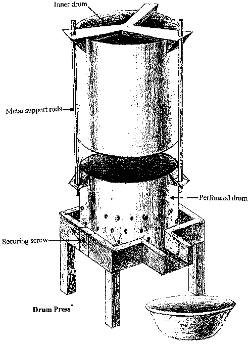 The drum press is suitable for making gari. The cotton bag containing the cassava pulp is placed inside the perforated drum. The second drum is lowered down and screwed in place as tightly as possible. This step is equivalent to placing weighted material on top of the bag of cassava pulp. As the cassava de - waters over a few days, the screws are tightened further to maintain pressure on the pulp. The water runs out of the press through the perforations in the outer drum and is collected in the bucket underneath the stand.