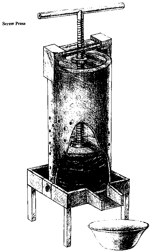 The screw press is of a very similar design and suitable for use in pressing out the water from root crop pulp to collect the starch. The outer drum dimensions are the same as for the drum press. Instead of the inner drum, there is a metal or wooden plate attached to a centre screw piece. As the screw torque is turned the wooden or metal plate presses against the pulp in the cotton bag and presses out the water. The screw torque is fixed onto the drum by a metal bracket. The support stand is of the same dimensions as that supporting the drum press.