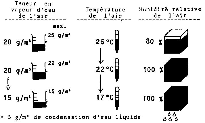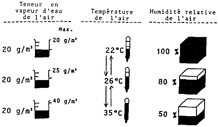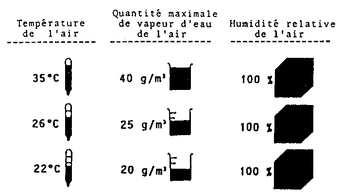 En d'autres termes, l'état de saturation (h.r. 100%) peut être atteint à différentes températures et pour différentes quantités de vapeur d'eau.