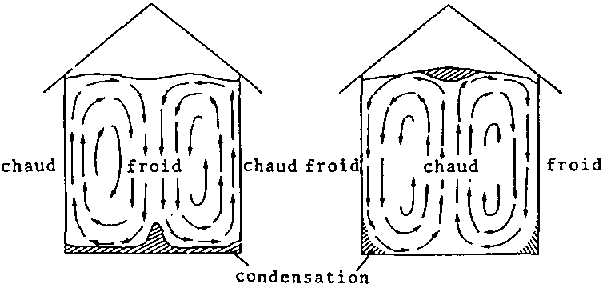 Lorsqu'un mur d'entrepôt est réchauffé de l'extérieur par les rayons solaires, l'air intérieur se trouvant au contact de ce mur se réchauffe lui aussi. L'air chaud monte. Le réchauffement fait baisser l'humidité relative. L'air peut ainsi absorber sur sa route l'humidité supplémentaire contenue dans la marchandise. Si cet air entre en contact avec des surfaces plus froides, il se refroidit et descend. Du fait de ce refroidissement, l'humidité relative augmente et peut même parfois atteindre le point de rosée, d'ou condensation.