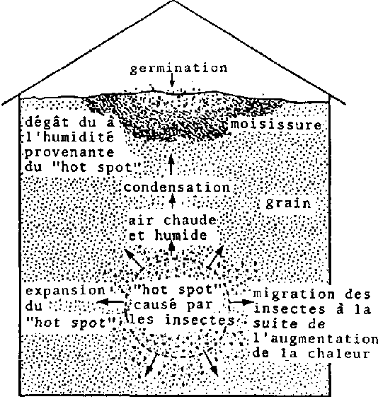 Températures élevées humidité relative élevée et taux d'humidité élevée de la marchandise stockée favorisent le développement des organismes pathogènes. La respiration des agents pathogènes produit de l'humidité et de la chaleur ce qui améliore encore ces conditions de développement et entraîne par là même un accroissement des populations de ravageurs.