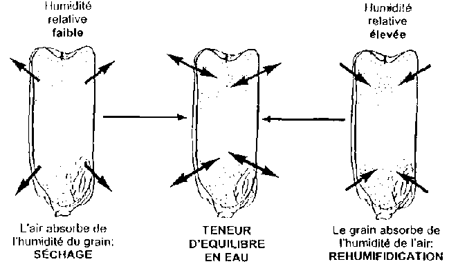 La teneur en humidité de la marchandise stockée et l'humidité relative de l'air ambiant tendent toutes deux vers un état d'équilibre qui est fonction de la température. Selon le taux d'humidité relative de l'air les denrées stockées libèrent del'humidité dans l'air (séchage) ou lui empruntent au contraire de l'eau (humidification) jusqu'à ce qu'elles parviennent a un état d'équilibre.