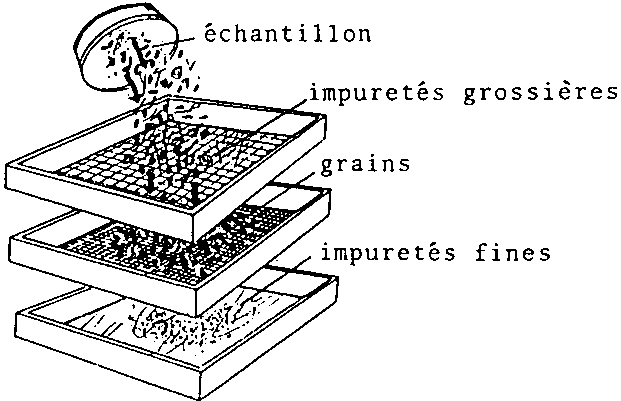 Les impuretés grossières, telles que les pierres, brins de paille, morceaux de tiges provenant d'épis de mais, etc. restent dans le tamis à larges mailles, tandis que le sable, la poussière, les insectes, les grains brisés, etc. passent à travers le tamis fin.