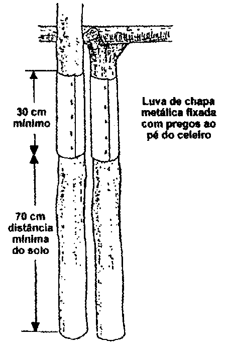 Os celeiros tradicionais, colocados sobre postes de madeira podem ser protegidos facilmente contra os roedores por meio de chapas metálicas. Estas não requerem grandes reformas nem investimentos caros. Colocadas correctamente, elas n,antêm afastados dos produtos armazenados possíveis roedores nocivos de maneira segura e durável. O mais importante é a observação das medidas mínimas indicadas na ilustração É óbvio que todos os postes devem ser equipados com uma chapa metálica e que não deve existir outra possibilidade de entrada para os roedores (p.ex. uma escada de mão encostada ao silo, ou pontes similares)