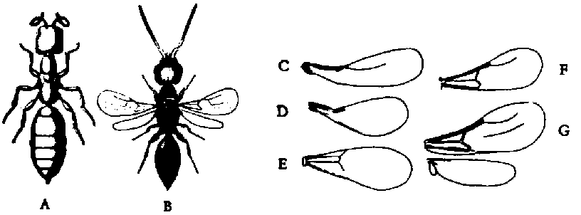 - Ecailles alaires antérieures petites n'atteignant pas les écailles postérieures (fig. 32 B) ............................................................................Termitidae