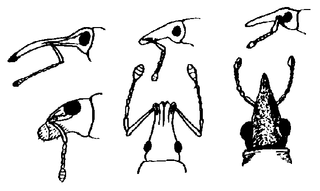 5. Antennes coudées. Rostre bien développé, parfois très long (fig. 44)......................Charançons (Curculionidue) (v. table 16)
