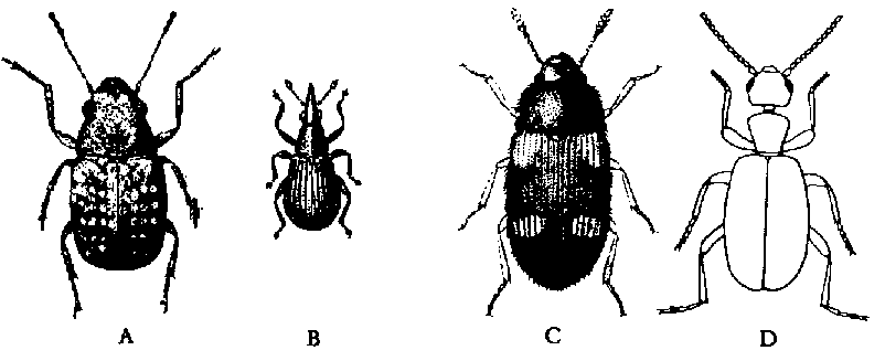 Les coléoptères sont bien caractérisés par la transformation des ailes antérieures en étuis cornés, durs, les élytres. Les ailes postérieures, membraneuses, sont repliées au repos sous ces dernières, mais elles sont parfois absentes. Il peut arriver que les deux élytres soient soudés l'un à l'autre. Les pièces buccales sont du type broyeur, les antennes très diversement constituées. La majorité des ravageurs des denrées entreposées se rattachent à l'ordre des coléoptères: ils sont très souvent importés à la faveur dés relations commerciales.
