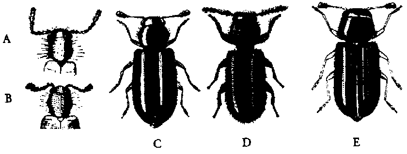 - Coléoptère long de 2,7-3 mm. Tête moitié aussi large que le pronotum dont les côtés sont légèrement explanés. Elytres avec stries longitudinales fortement ponctuées. Brun-roux (fig. 48 A) ................ Lophocateres pusillus (KLUCI, 1832) (Ostomidae)