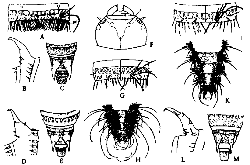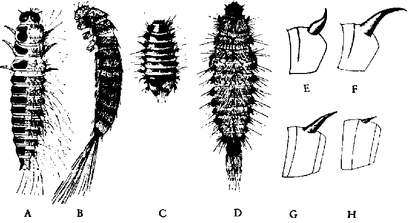 1. Sur le 9e segment abdominal, 2 fortes épines (urogomphes) qui, chez les jeunes larves, sont encore petites et n'ont pas atteint leur forme caractéristique. Le tergite et le sternite de chaque segment abdominal sont soudés; ceux du 10e segment forment un anneau complet tandis que sur la face ventrale apparaît une ligne médiane claire qui peut être de largeur variable sur les différents segments (fig. 75H, K). Sur le côté dorsal, en arrière du bord antérieur des segments abdominaux 3-10, se trouve une rangée de petites plaques sclérotinisées, rondes, cordiformes, ou en forme de bouteille ou de calice. Larves allongées avec soies denses et hérissées (fig. 74 A). Pour l'identification spécifique, des larves d'au moins 12 mm sont nécessaires