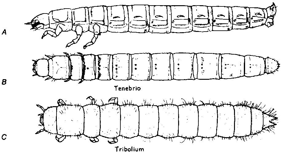 Fig. 81. Larves A, B. de Tenebrio et C, de Tribolium (d'après KORSCHEFSKY).