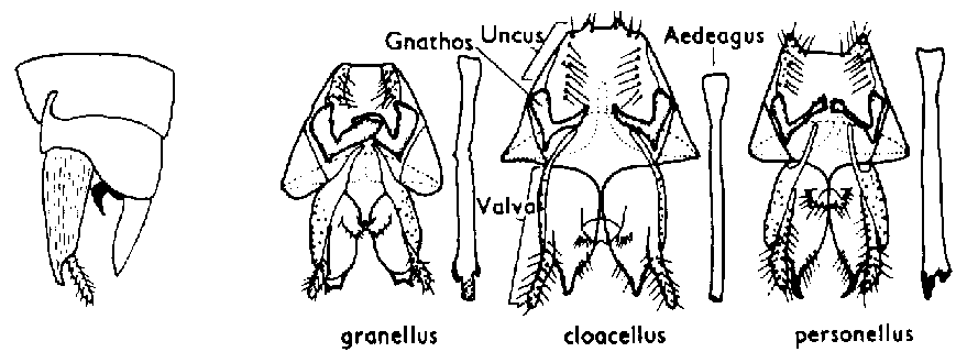 14. Chez le mâle, à la basé de l'aile antérieure, un pinceau de poils est caché sous le repli costal; chez la femelle, l'ovipositeur est court, peu extensible. 8e segment abdominal plus large que long (fig. 94 B-E)