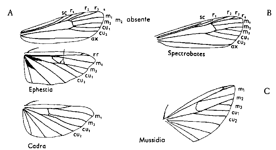 - A l'aile antérieure, médiane à 2 branches (m1; m3; m2 absente) (fig.89 A, en haut). La distinction des espèces suivantes est basée, de préférence, sur l'examen des organes copulateurs (fig. 92, 93). Elles se rattachent toutes au grand genre Ephestia qui, en 1956, a été subdivisé en trois genres: Anagasta, Ephestia et Cadra de plus en plus utilisés dans la littérature concernant les insectes des denrées entreposées. Depuis 1964, une tendance se manifeste, parmi les taxinomistes, de ramener ces genres au statut de sous-genres
