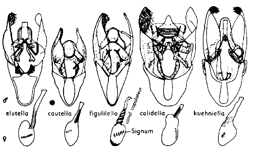Chez la femelle, le canal copulateur (ductus bursae) est muni, lorsqu'il débouche dans la bourse, de nombreuses petites dents sclérotinisées en forme de plaquettes et disposées en spirale. Signum de 0-6 tubercules (Pl. D, fig. b). Chez le mâle, l'appendice digité du côté renforcé (costa) de la valve est petit et situé immédiatement avant son extrémité (fig. 92,93 E) .........Mite de la farine, Ephestia (Anagasta) kuehniella (ZELLER, 1879)