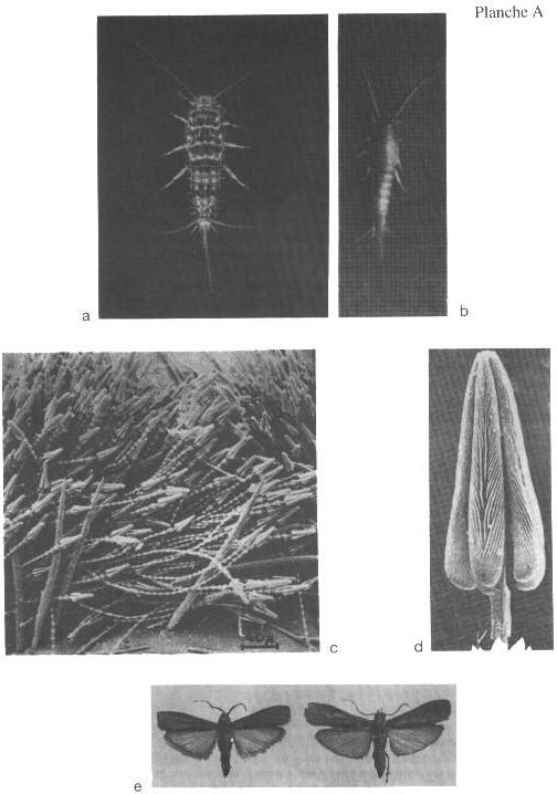 - Soies p des 9 premiers segments du corps courtes. Tégument du thorax et de l'abdomen entre les verruqueux sur lesquels sont insérées les soies, densément pourvu de microscopiques spinules, sans fins poils érigés. Tête brun foncé. Pattes ventrales avec 28-31 crochets. Lg. 6,5-8,5 mm. La chenille vit dans un fourreau ouvert à l'avant et à l'arrière et qu'elle porte avec elle (fig. 98B)............................................................................... Mite des fourrures, Tinea pellionella LINNÉ, 1758)