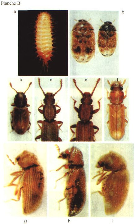 Rangée moyenne: c, Ahasverus advena; d, Oryzaephilus