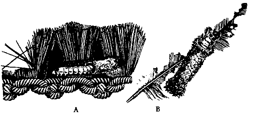 Fig. 98. Chenilles de: A, Tineola bisselliella; B. Tinea pellionella (d'après DIEHL-WEIDNER).