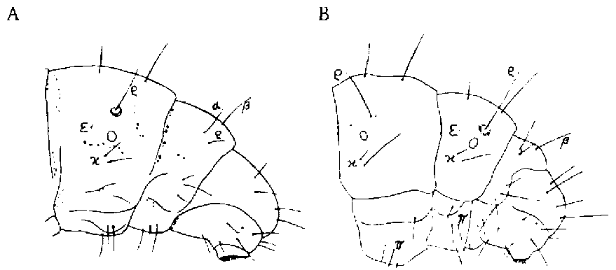 - Soies c et h des 7 premiers segments abdominaux disposées sur une ligne presque horizontale; c est située nettement en dessous du stigmate (fig. 97 B)
