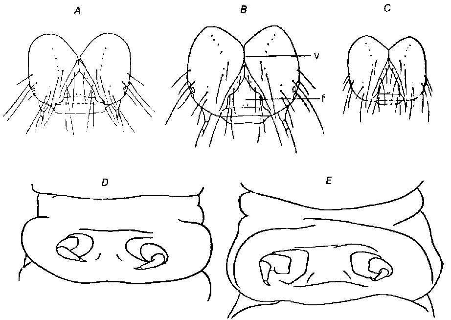 - Soies dorsales (a et ß) avec taches foncées à leur base (fig. 95, Ephestia). La plaque triangulaire de la face antérieure de la tête (à l'exception d'E. kuehniella) correspond à la moitié de la distance qui sépare son bord antérieur du vertex (fig. 100 B et Pl. C, fig. i). Les crochets des pattes abdominales sont de deux sortes quant à leur longueur, les petits correspondant au tiers des grands. Chenilles blanchâtres, souvent avec un ton coloré qui dépend du contenu intestinal. ............ Ephestia 15