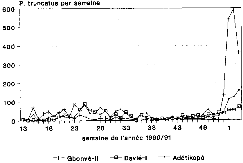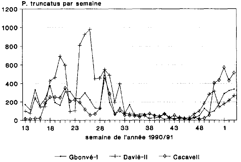 Le nombre de P. truncatus capturés différait fortement suivant les sites. La figure 15 représente les sites où les prises étaient les plus nombreuses. Les prises les plus importantes ont eu lieu à Davié-II, où l'on a pu capturer jusqu'à 1 000 P. truncatus par semaine. Sur les deux autres sites, le nombre de prises oscillait plus ou moins fortement entre 100 et 400 P. truncatus par semaine environ. Au cours de la période allant de début septembre (35e/36e semaine) à fin novembre (47e/48e semaine), c'est-à-dire la période de faible prise, le nombre de P. truncatus capturés variait entre 10 et 70.
