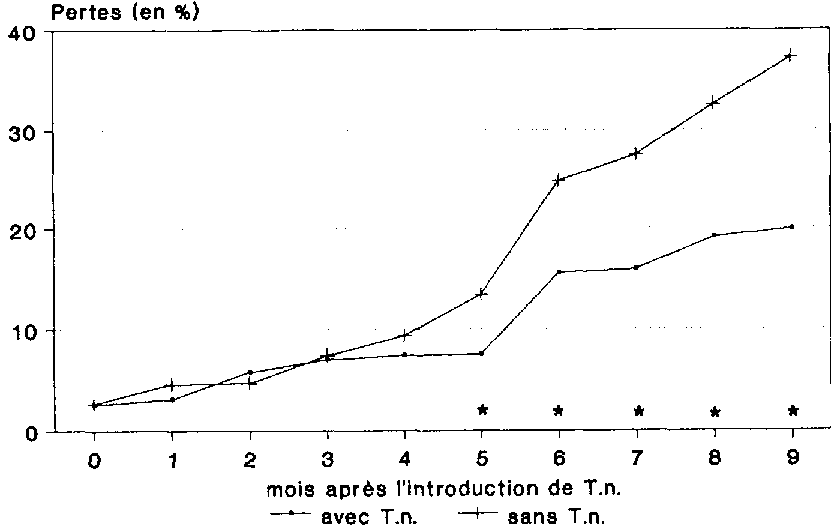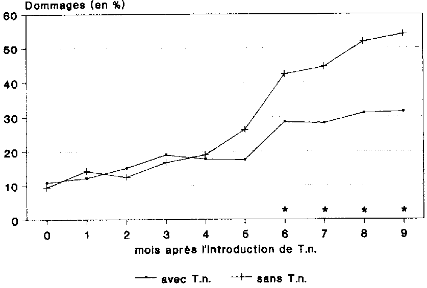 Au moment de l'introduction du prédateur T. nigrescens dans les greniers à maïs, les dommages s'établissaient aux alentours de 10 % dans les deux variantes (fig. 21). Au cours des quatre mois suivants, on a enregistré une légère progression des dommages, qui atteignaient alors environ 20 % dans les deux variantes, une nette différence apparaissant par la suite.