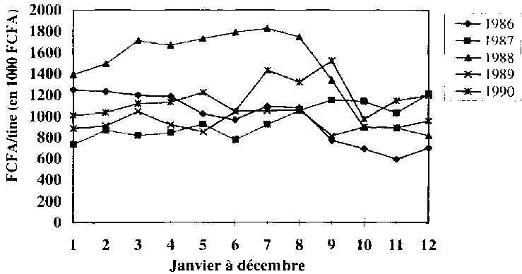 L'exploitation des statistiques de prix sur une période de huit ans révèle des différences de prix très accentuées suivant les saisons. Pour être à même de confirmer ou d'infirmer l'existence de cette tendance, il faudrait continuer, le cas échéant directement sur les marchés de village et sur une période prolongée, d'étudier ces cycles de prix.