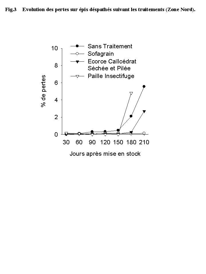 | Fig. 3 | Evolution des pertes sur épis déspathés suivant les traitements (Zone Nord). |