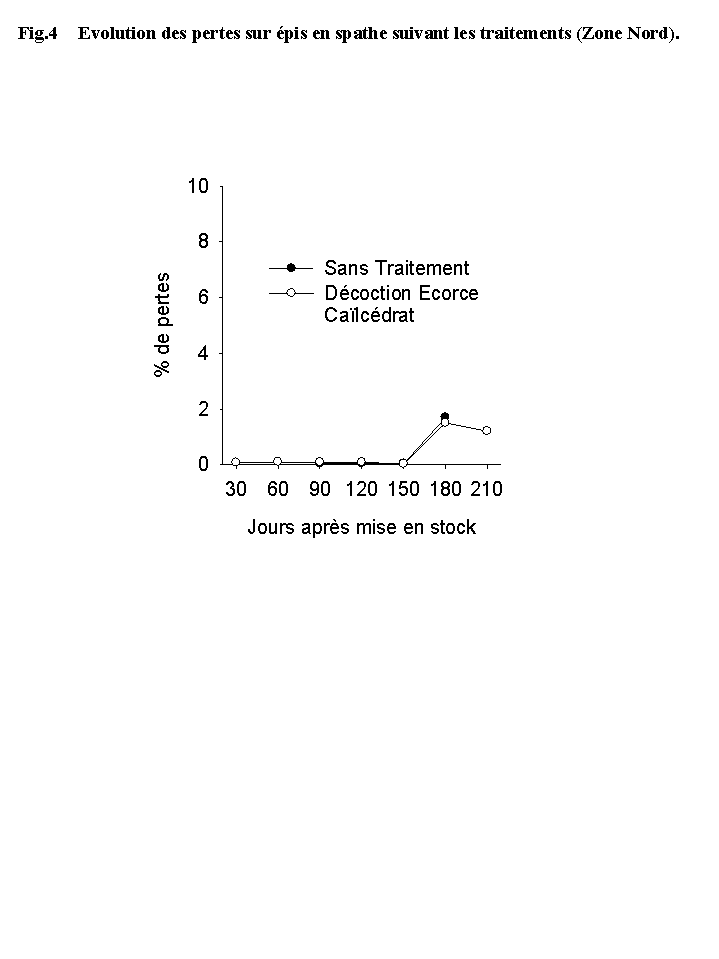 | Fig. 4 | Evolution des pertes sur épis en spathe suivant les traitements (Zone Nord). |