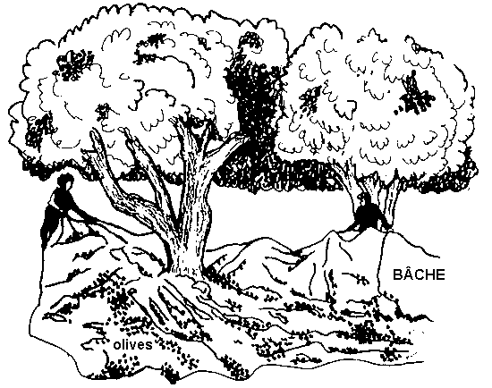 Contrairement à la plupart des fruits du genre "noix", il ne faut pas gauler les pistaches pour les récolter, à cause de leur coque ouverte et d'une teneur en eau relativement élevée La méthode de cueillette illustrée ci-dessous donne de bons résultats quand on l'applique aux pistaches et aux olives. On étale sous l'arbre en question des feuilles de plastique ou des bâches de toile et on secoue ensuite l'arbre par machine ou manuellement (en frappant les branches avec des maillets) jusqu'à ce que les fruits tombent. Dans l'illustration ci-dessous, deux cueilleurs ramassent un drap couvert de fruits.