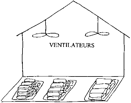 Si les radiateurs se trouvent près du plafond, on peut se servir de ventilateurs plafonniers pour redistribuer la chaleur et la faire descendre dans la salle. Il faut superposer les bacs de façon à Laisser un espace de 10 à 15 cm (4 à 6 pouces) entre les rangées pour assurer une circulation d'air suffisante.