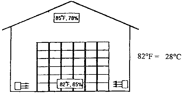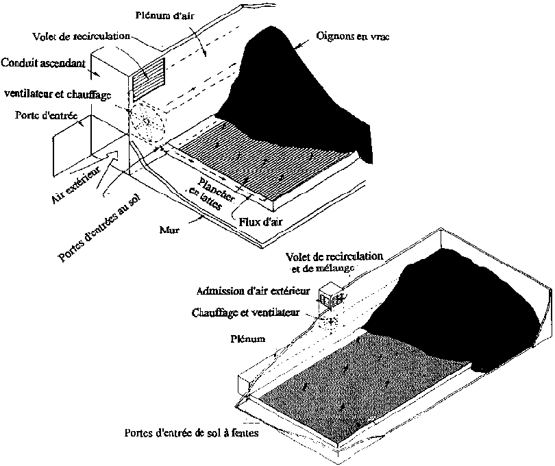 Un système de pré-conditionnement en vrac exige un ventilateur, un radiateur et un plancher en grilles. Les illustrations ci-dessous indiquent comment faire entrer l'air, le chauffer et le faire circuler à travers un lot d'oignons en vrac dans la salle de séchage. Une ouverture d'échappement près du plafond recycle l'air chauffé.
