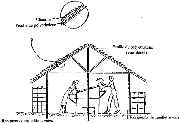 On peut construire une simple station de conditionnement en plein champ à l'aide de pieux de bois et d'une feuille de polyéthylène. Du chaume sur le toit donnera de l'ombrage et gardera la station fraiche. Il faudra orienter cette station pour que la saillie du toit arrête la plupart des rayons du soleil.