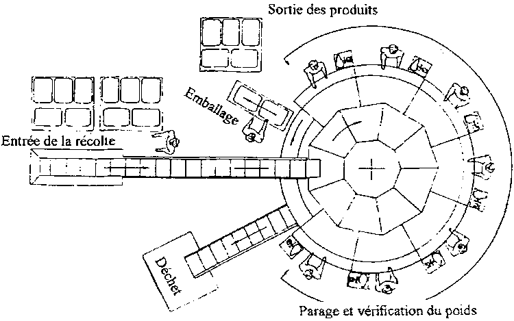 On peut se servir d'une table ronde et tournante pour conditionner une variété de produits. L'emballage des produits se fait à l'aide d'un convoyeur si il est disponible (si non, on met les produits directement sur la table), où les conditionneurs font la sélection et remplissent les boîtes de carton à leurs stations respectives. Dans l'illustration ci-dessous, on a ajouté une bande de rejets au-dessous de la bande d'apport, pour faciliter l'élimination des produits de rejets.