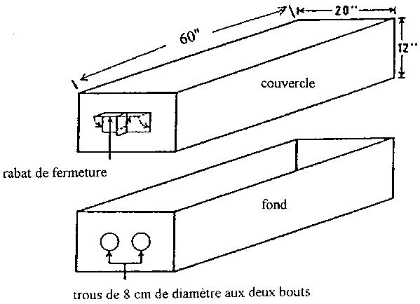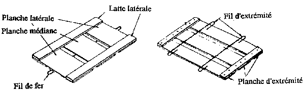 On peut construire des conteneurs en bois et en fil métallique en suivant les schémas généraux ci-dessous. Un outil spécial de fermeture facilite le pliage des boucles de fil métallique sur le couvercle de la caisse. Les caisses assujetties par du fil métallique s'emploient pour de nombreux produits tels que les melons, les haricots, les aubergines, les légumes feuillus, les poivrons, les courgettes et les agrumes. Package Research Laboratory (41 Pine Street, Rockaway, New Jersey 07866, USA) peut vous fournir une liste de fournisseurs dans différentes régions des USA.