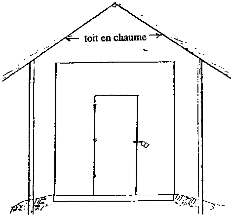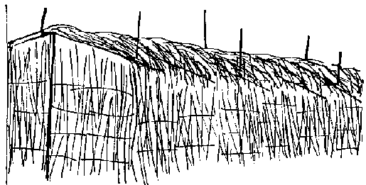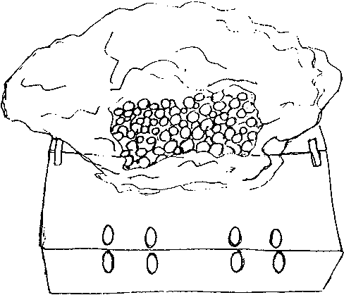 La chambre de refroidissement peu coûteuse illustrée ci-dessous est faite de briques. La cavité entre les murs est remplie de sable, et les briques et le sable sont saturés d'eau. Les fruits et légumes sont placés à l'intérieur, et la chambre entière est recouverte d'une natte en joncs également tenue humide. Comme il faut une assez grande quantité de matériaux pour construire cette chambre froide elle peut n'être utile que pour des produits de grande valeur.