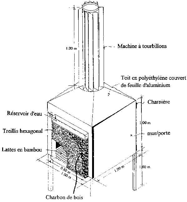 Le refroidisseur par évaporation montré ci-dessous est équipé d'une machine à tourbillons d'air. On a employé un grillage à mailles hexagonales pour construire deux boîtes minces sur des côtés opposés du refroidisseur ces boîtes sont remplies des morceaux de charbon de bois humides ou de la paille mouillée. L'eau s'écoule goutte à goutte sur le charbon de bois ou la paille, et l'air met la turbine en mouvement, faisant circuler l'air froid et humide à travers les produits à l'intérieur du refroidisseur. Quand on emploie ce refroidisseur, les températures sont réduites de 3° à 5°C en dessous de la température ambiante et l'humidité relative est d'environ 85%.