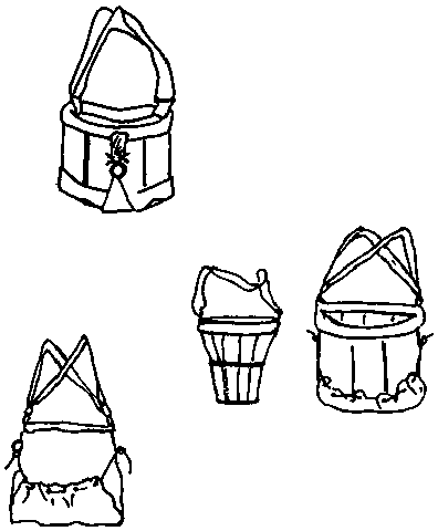 Se pueden encontrar cestas, bolsas y cubetas de cosecha de diferentes tamaños y formas. Estos recipientes pueden hacerse tejiendo las bolsas de tal manera que se dejen ambos extremos abiertos para luego colocar lonas como fondo de las cestas ya preparadas, o bien colocarles bolsas con arneses ajustables o simplemente adaptar unas correas a los pequeños cestos. Las ilustraciones siguientes muestran algunos ejemplos.