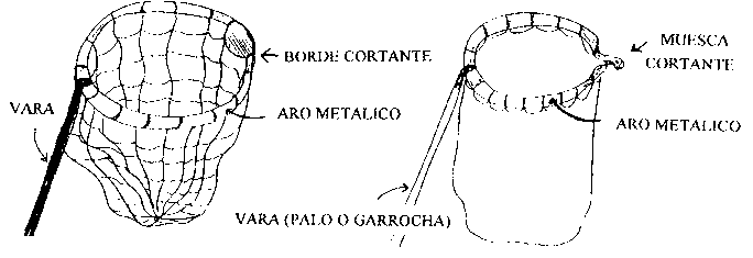 Las varas y sus bolsas colectores pueden ser hechas a mano 0 comprarse en las compartías suministradoras de instrumentos para horticultura. Las bolsas colectores que a continuación se ilustran se tejen a mano con un cordel fuerte o se confeccionan con tela de lona. El aro usado como borde de la bolsa así como las muesca cortante pueden hacerse a partir de una hoja de lámina, tubo de acero o piezas de metal reciclado.