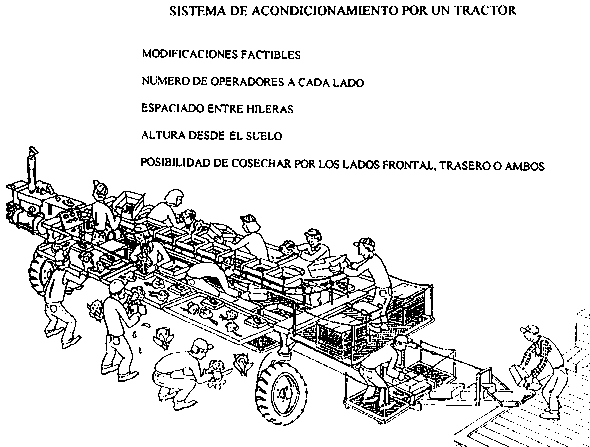Cuando el cultivo se cosecha a cierta distancia de la empacadora, el producto debe ser transportado antes de acondicionarse. El sistema transportador movido por gravedad que se utiliza para las bananas, y que a continuación se ilustra, es un ejemplo de cómo el manejo puede minimizarse durante la preparación para el mercadeo. Los racimos de banana cosechados se llevan a las plataformas dispuestas a lo largo de toda la linea transportadora y entonces se alzan y se cuelgan mediante unos ganchos unidos al cable. La velocidad de transporte es controlada por los operarios que conducen el producto a la empacadora localizada en la parte inferior del terreno inclinado o de la pendiente.