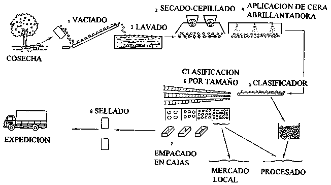 Una serie típica de operaciones en una empacadora se ilustra a continuación. El vaciado puede realizarse en seco o en agua, dependiendo del tipo de producto de que se trate. La limpieza, igualmente. puede llevarse a cabo con agua clorada o cepillado en seco. El encerado, si se practica, tiene que realizarse después del lavado y eliminación de la humedad superficial. La clasificación por tamaño, como se ilustra, divide el producto en categorías destinadas al mercado en fresco y al procesado. Una selección adicional separará el producto de menor tamaño para el mercado local o para ser procesado. Normalmente, los productos de mejor calidad son empacados y vendidos a nivel regional o nacional.