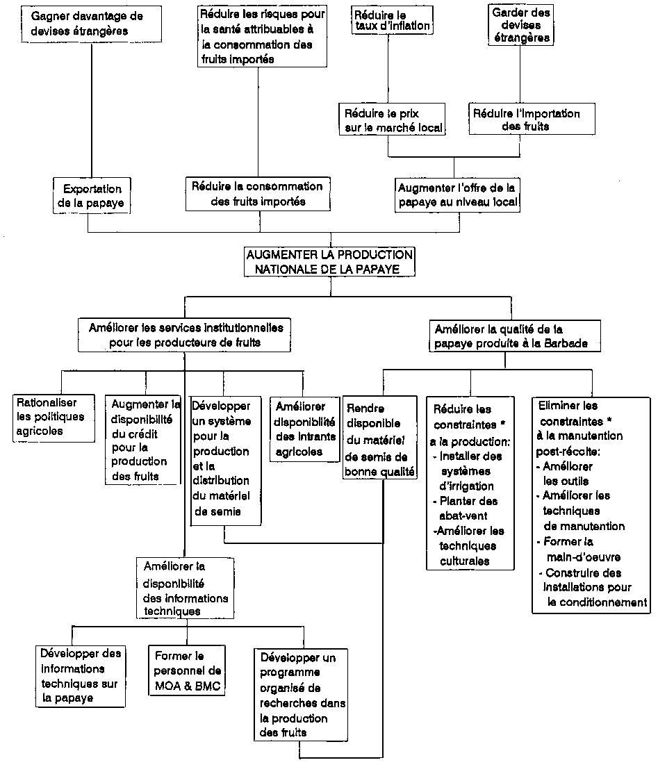 La Figure 5.1 présente des informations provenant du Tableau 5.1 sous la forme d'un arbre de problèmes. Dans ce cas-ci, le problème central prend la forme "Niveau bas de production nationale de la pagaye." Les causes de ce problème central, telles qu'elles sont indiquées à la Figure 5.1, sont attribuables, d'un côté, aux "mauvais services institutionnels offerts aux producteurs de pagaye", et, d'un autre côté, à la "mauvaise qualité de la papaye." Les causes de chacun de ces problèmes respectifs s'identifient aux niveaux inférieurs de l'arbre de problèmes. Les problèmes qui n'avaient pas été identifiés au Tableau 5.1, mais qui ont été identifiées pendant la discussion au cours de la préparation de l'arbre de problèmes, sont marqués d'un astérisque (*).