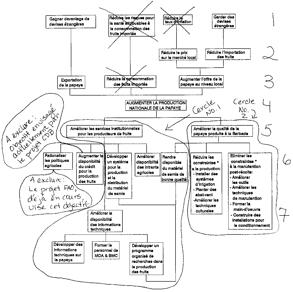 Si l'on en revient à l'exemple de la papaye à la Barbade, l'analyse des participants a démontré que la FAO venait de lancer un programme d'appui technique pour aider le Ministère de l'Agriculture à rationaliser ses politiques agricoles. De plus, des interviews menés auprès de certains spécialistes ont déterminé que la Banque de Développement Caraïbe (CDB) venait d'autoriser un prêt à la Banque de Développement de la Barbade afin de fournir du crédit à des producteurs de fruits. Par conséquent, parce qu'on estimait que les problèmes dans ces deux domaines étaient déjà en train d'être résolus, on a pu les exclure ces deux cercles qui entouraient les idées pour des projets possibles (Figure 5.3). Toujours est-il que les actions de la part de la FAO et de la CDB continuent à faire partie intégrale de la stratégie globale visant l'amélioration de la production fruitière à la Barbade.