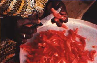 73. Nous découpons chaque moitié de tomate en tranches épaisses d'un centimètre, le plus régulièrement possible. Ces tranches de même épaisseur mettront donc le même temps pour sécher.