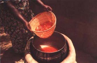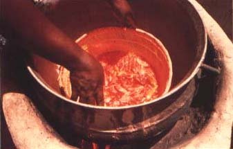 79. Nous mettons les tranches de tomate dans un tissu ou dans un panier bien propre, et nous plongeons le tout dans cette eau bouillante pendant trois minutes. C'est ce qu'on appelle le trempage.