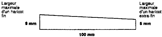 Les haricots extra-fins doivent avoir au moins 100 mm de long et au plus 6 mm de large; les haricots fins peuvent avoir jusqu'à 9 mm de large. Pour aider le personnel inexpérimenté à les classer correctement au début de la saison, on a fabriqué de petites baguettes de fer blanc, de bois ou de carton longues de 100 mm et larges de 6 mm à un bout et 9 mm à l'autre.