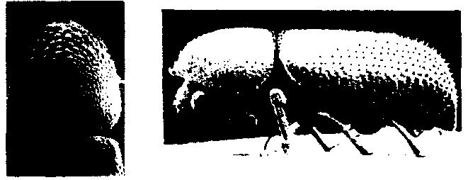 a) Petit coléoptère de forme presque cylindrique, dont la tête est « repliée »sous le thorax de sorte qu'elle est invisible du dessus. Sur le thorax est disposée toute une série de protubérances, comme le montre le croquis. Dinoderus spp. (également de la famille des Bostrychidue) apparaît parfois aussi dans le maïs. Il présente une forme cylindrique semblable, mais nettement plus courte et plus trapue.
