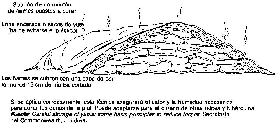 Habida cuenta de que todas las cosechas de raíces y tubérculos sufren algún deterioro durante la recolección y la manipulación, las curas deben realizarse lo antes posible. Para ello se puede limitar la ventilación, lo que permite que la temperatura suba lo suficiente para promover la curación. Al mismo tiempo, el aire se humedece debido a la producción normal de agua de las raíces y al alto grado de evaporación por las zonas lesionadas (Figura 33).