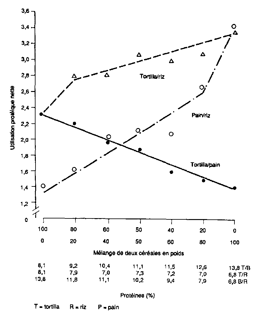 Le sorgho a également été traité par cuisson à la chaux au Mexique et en Amérique centrale, en particulier dans les régions où le maïs ne pousse pas bien. Toutefois, les tortillas de sorgho n'ont pas la même qualité organoleptique ou nutritionnelle que les tortillas de maïs. Plusieurs tentatives réussies ont été faites pour utiliser des mélanges de ces deux céréales, notamment par Vivas, Waniska et Rooney (1987) et Serna-Saldivar et al. (1987, 1988a, 1988b). Il existe d'autres méthodes, par exemple l'utilisation de mélanges de maïs commun, puisque l'on a affirmé que la germination accroissait la teneur en lysine. Des mélanges de farines à tortilla et de riz, ou de farine à tortilla et de farine de froment, ont également été étudiés. Les produits à base le riz/maïs ont une plus grande valeur nutritive que les tortillas de froment/ maïs, ainsi qu'il ressort de la figure 4. Ces résultats font apparaître la supériorité du riz sur la farine de maïs entier et celle de cette dernière sur la farine de froment. Plus récemment, on a pu montrer que des mélanges de grains d'amarante et de farine de maïs cuite à la chaux présentaient une qualité protéique améliorée en raison de la teneur très supérieure en lysine et en tryptophane de l'amarante par rapport au mais. On a affirmé que le produit offrait une qualité organoleptique acceptable. Parmi les autres produits d'ajout, on peut citer la pomme de terre, le riz et les haricots pinto, qui fournissent des aliments aux qualités organoleptiques acceptables.