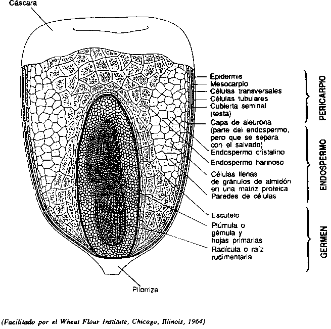 El grano de maíz se denomina en botánica cariópside o cariopsis; cada grano contiene el revestimiento de la semilla, o cubierta seminal, y la semilla, como se ve en la Figura 1 (FIGURA.1.Estructura del grano de maíz: corte longiludinal aumentado aproximadamente 30 veces). En la figura se muestran también las cuatro estructuras físicas fundamentales del grano: el pericarpio, cáscara, o salvado; el endospermo; el germen o embrión; y la pilorriza (tejido inerte en que se unen el grano y el carozo). Wolf et al. (1952) y Wolf, Koo y Seckinger (1969) han descrito adecuadamente la anatomía general y la estructura microscópica de estos elementos anatómicos. También han estudiado la estructura del maíz opaco-2 mejorado y han determinado que se diferencia del común en lo tocante al endospermo: su matriz proteica es más delgada y presenta menos y más pequeños cuerpos proteicas, pues en el maíz opaco-2 se da una limitación de la síntesis de zeina. Robutti, Hoseny y Deyoe (1974) y Robutti, Hoseny y Wasson (1974) han estudiado la distribución proteica, el contenido de aminoácidos y la estructura del endospermo del maíz opaco-2.
