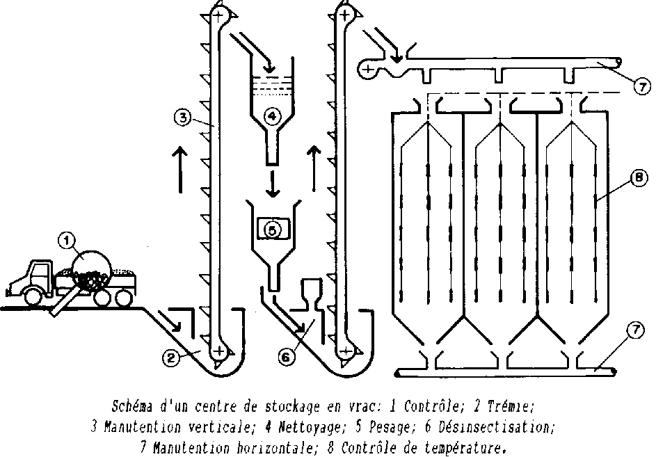 Compte tenu des importantes quantités de produit à gérer, les centres de stockage en vrac doivent être équipés non seulement de silos de capacité adéquate, mais aussi d'installations capables d'assurer une exécution rapide et aisée des opérations de réception, traitement, stockage, contrôle et vidange des grains.