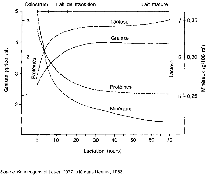 Le lactose pourrait être un témoin d'une régulation de la production lactée car, de tous les composants, il est l'un de ceux dont le taux varie le moins au cours de la lactation (70 g/litre avec un coefficient de variation inférieur à 4 pour cent) (figure 2). Le lactose semble favoriser l'absorption de certains minéraux (calcium, magnésium, phosphore) et d'oligo-éléments (zinc notamment). Cet effet n'est peut-être pas direct, mais dû à l'acide lactique, produit dérivé du lactose sous l'effet du métabolisme microbien. ApH acide, les sels calciques sont plus solubles et donc mieux résorbés. Le lactose, par le biais du galactose et du glucose puis de l'acide lactique produit, influence la nature de la flore microbienne intestinale. En milieu acide, la flore basophile protéolytique de putréfaction ne peut se développer. Une flore acidophile domine, apparemment de nature plutôt anaérobie (bifide).